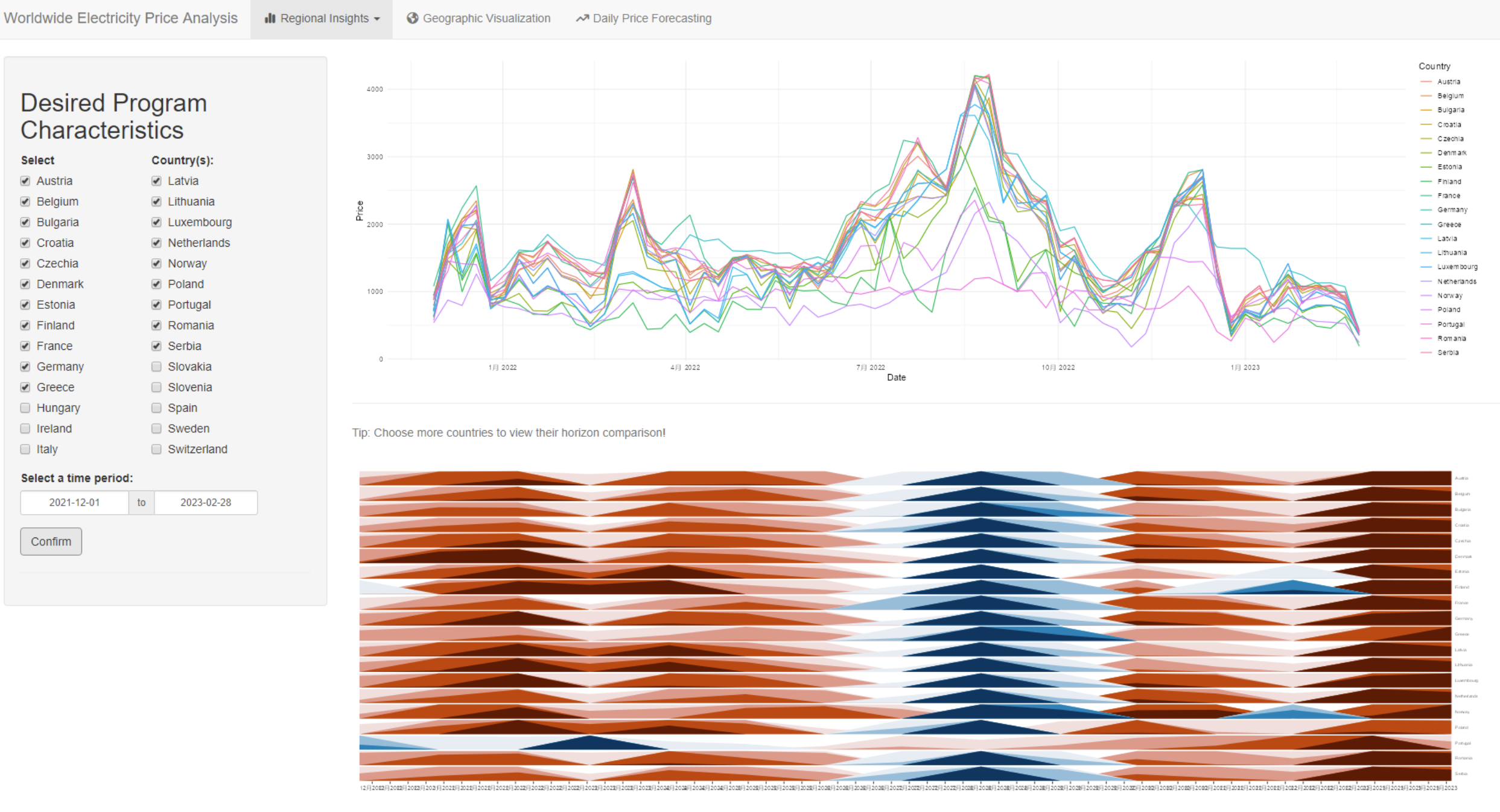 The geographic visualisation analysis used country location and price to create an interactive and dynamic visualization of electricity prices in Europe. The method involved using a colour-coded map of Europe, with each country’s price represented by a different colour or shade. The intensity of the colour or shade represented the depth of the price, with darker colours indicating higher prices.
