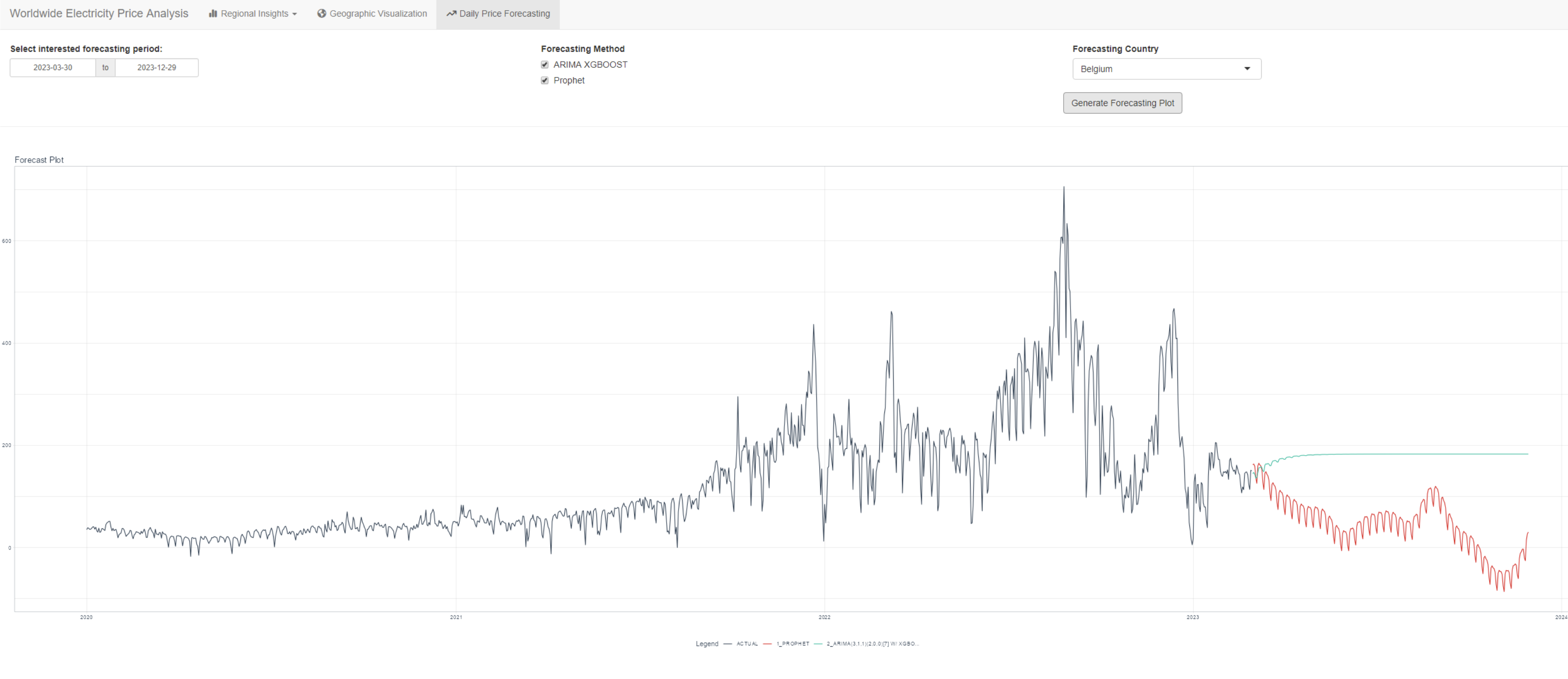 The Prohect and ARIMA models were used to forecast the electricity prices in Europe for a user-entered number of days. This method involved analyzing historical price data, identifying trends and patterns, and then using these insights to generate forecasts for future prices.
