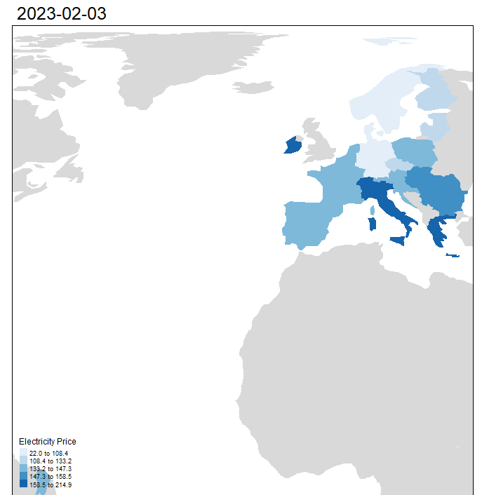 The visualisation was presented in GIF format, which allowed the audience to view the price change smoothly over time. This provided a useful way to understand the fluctuations and trends in electricity prices across Europe. By visualizing the price changes in this way, businesses and analysts could quickly identify areas of high or low pricing, as well as the factors that contributed to price movements.
